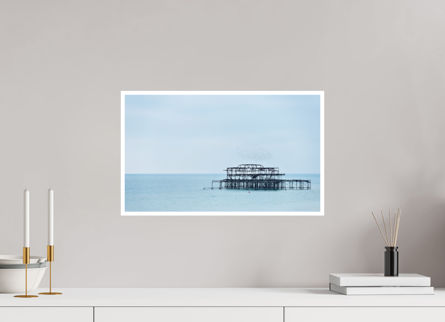 This image captures sea birds flying over the derelict structure in Brighton, south of London in the UK. This image benefits from a large print format. Printed on Hahnemuhle Photo Rag.