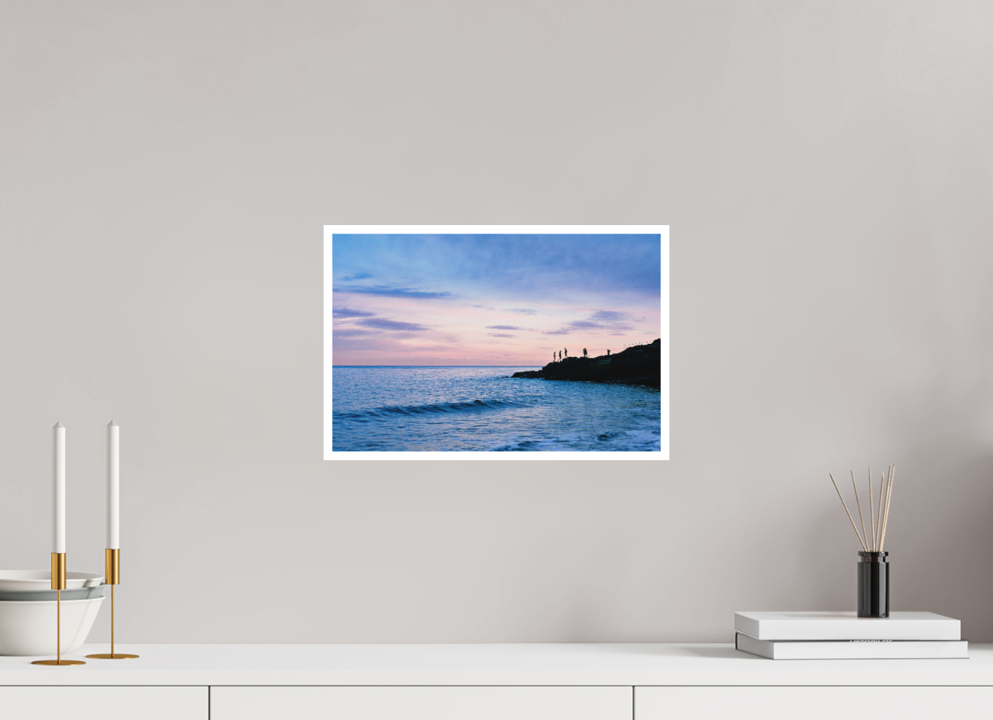 This twilight scene at The Cove in Greystones was captured on slide film, perfectly preserving the delicate lavender and blue hues of dusk. Silhouetted figures traverse the rocky coastline, creating a sense of scale and human connection with the landscape. The photograph captures that fleeting moment when day transitions to night along the Wicklow coast. Printed on Hahnemuhle Photo Rag.